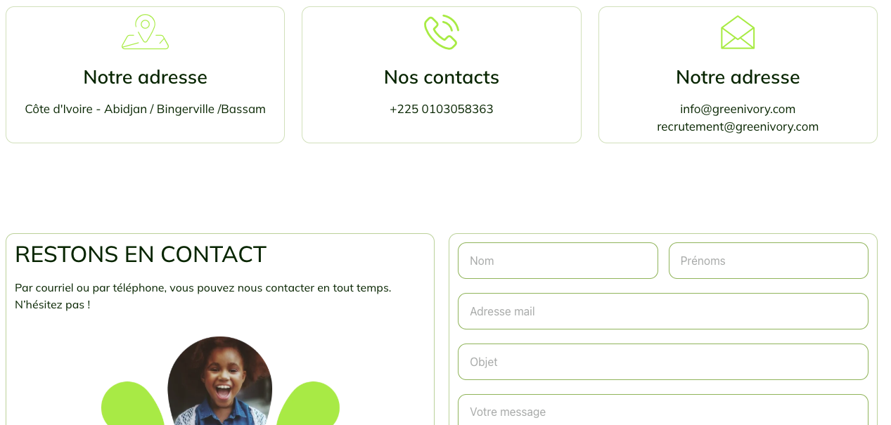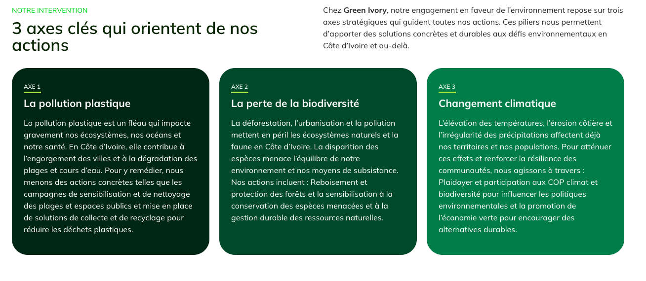 Publication d’un site opérationnel qui structure la présence digitale de Green Ivory.Amélioration de la visibilité en ligne de l’organisation grâce à une structure SEO adaptée.Facilitation de l’engagement citoyen via une navigation claire vers les actions de sensibilisation et de don.Base technique prête à accueillir l’évolution du site (ajout d’événements, d’activités terrain, d’inscriptions).