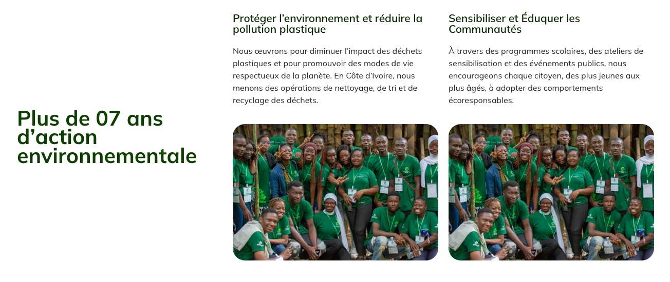 renforcer la visibilité de Green Ivory comme acteur incontournable de l’environnement en Côte d’Ivoire,informer et sensibiliser le grand public, notamment les jeunes, aux enjeux de la pollution plastique et du climat,mobiliser la participation citoyenne (inscription, dons, bénévolat) via une plateforme web accessible.
