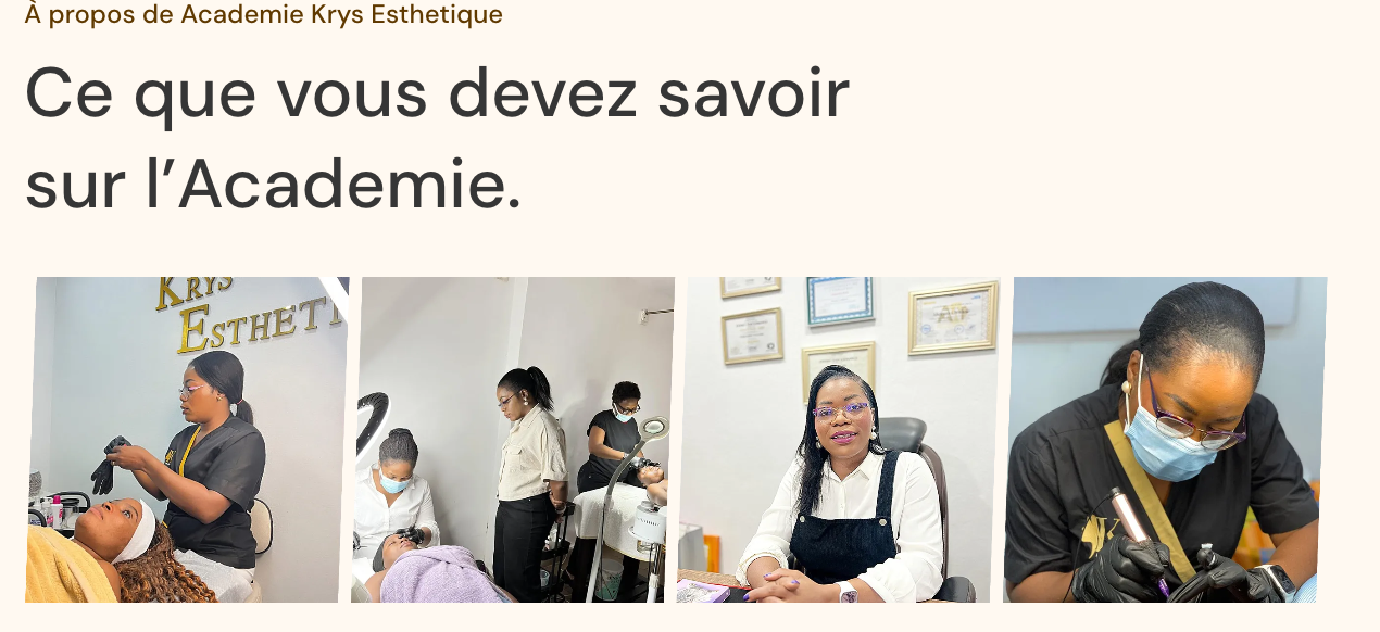 Krys Esthétique est un institut de beauté et centre de formation basé à Abidjan. Le site présente les différents soins du visage, du corps et les formations professionnelles proposés par l’institut. Le design sobre et raffiné met en valeur les services, les tarifs et les offres de formation à travers une navigation claire et des visuels harmonieux.